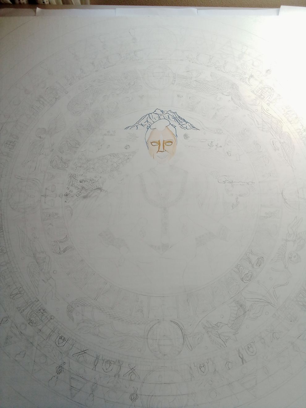 今回の絵のアイデアは4年前の2021年。下書き用の紙に下絵を描いたまま、そのままクローゼットにしまっておいたものでした。一回キャンバスに下絵をかいて製作準備はしていたけれど、他の事で忙しかったり、豪雨などでキャンバスの保存状態が悪くダメージがあってできなくなったりとなかなか形にできなかった数年でした。
