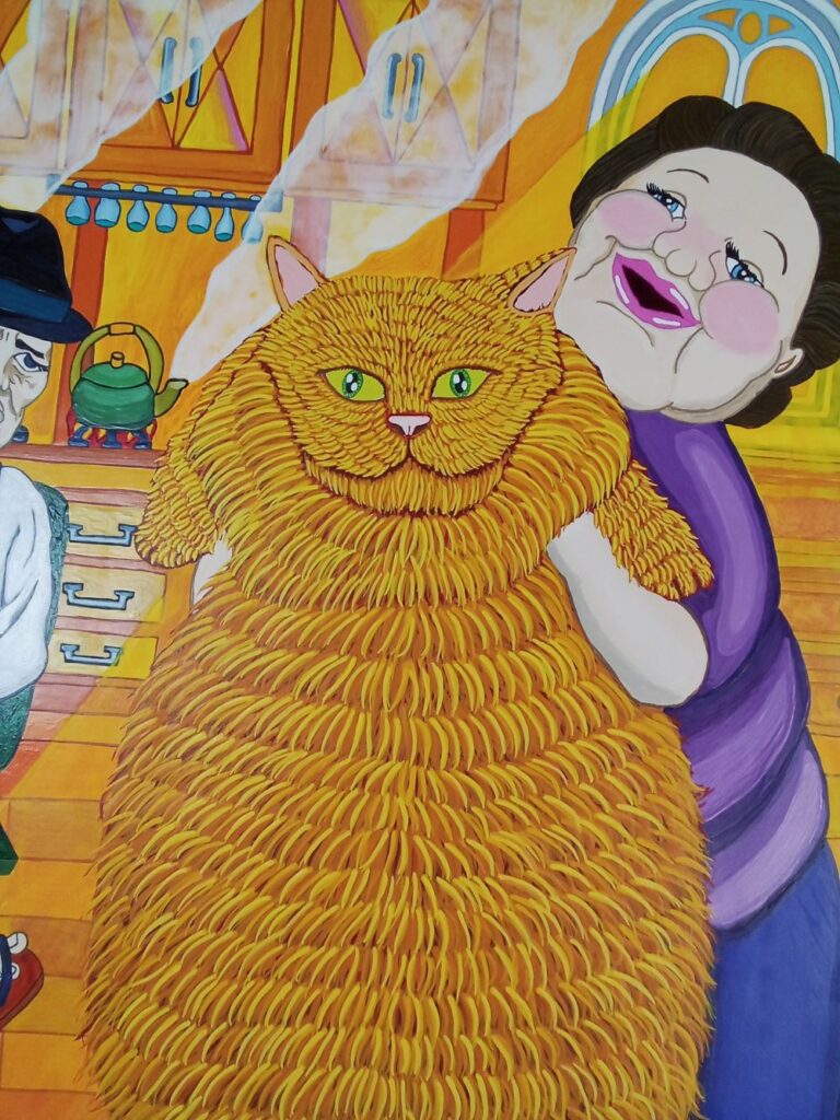 大きい猫の絵ですが、水彩画の滲みが好きです。アクリル画で全く同じようには描けないので(画力によるので・・・)